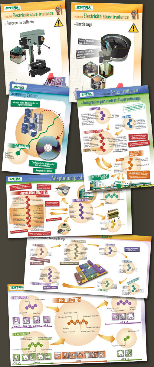 Réalisation d'une vingtaine de panneaux pour l'ASBL Entra. Panneaux A2 et 2m² destinés à présenter les activités et le process des secteurs de l'entreprise.